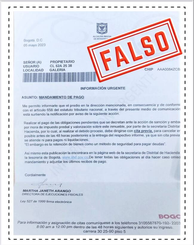 La Secretaría de Hacienda y el Instituto de Desarrollo Urbano (IDU) hicieron un llamado a la ciudadanía a que no caiga en falsas comunicaciones como cartas, correos electrónicos y/o llamadas telefónicas en las que solicitan el pago por supuesta mora del impuesto Predial o en la contribución de Valorización.