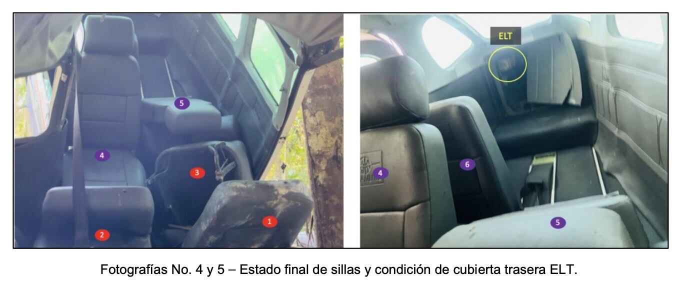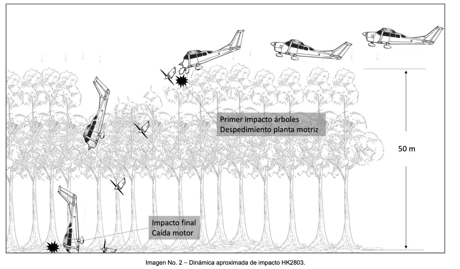 “La aeronave se encontró en posición vertical con evidente impacto frontal y características de alto ángulo de impacto y baja velocidad. La inspección detallada de los restos indicó que, durante el arborizaje, se produjo un primer impacto contra los árboles; este golpe ocasionó la separación del motor con su cubierta y hélice de la estructura de la aeronave, a partir de la pared de fuego”, señaló el informe.