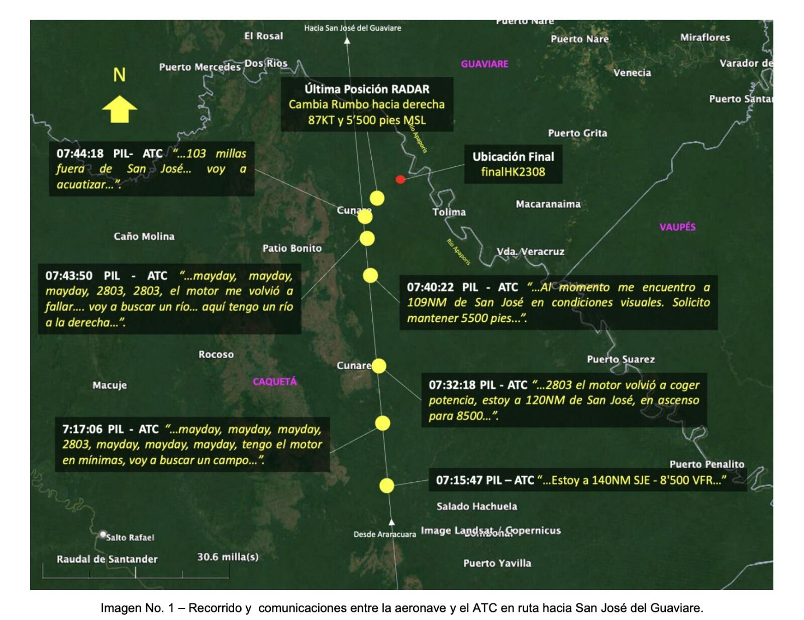 A las 07:43 el Piloto volvió a hacer un llamado de auxilio “…Mayday, Mayday, Mayday, 2803, 2803, el motor me volvió a fallar…. voy a buscar un río… aquí tengo un río a la derecha”, y un minuto después confirmó “103 millas fuera de San José… voy a acuatizar…”. Esta fue la última comunicación recibida del Piloto de la aeronave HK2803. Fueron varios días de búsqueda de la aeronave que inicialmente se reportó como desaparecida.