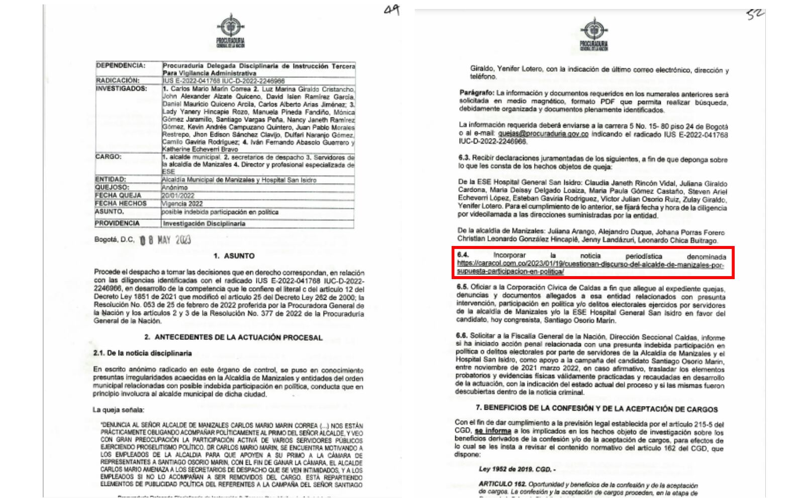El documento destaca que “existe evidencia probatoria que determina los posibles implicados con las conductas desarrolladas por los siguientes funcionarios de la alcaldía de Manizales y de la ESE Hospital San Isidro ESE, se dispondrá a abrir investigación disciplinaria”, al igual que destaca que “De conformidad con la noticia disciplinaria y con los medios de prueba hasta ahora obrantes en el proceso, encuentra el despacho que es necesario abrir investigación disciplinaria por la presunta intervención indebida en política por parte de los servidores públicos antes enlistados”.