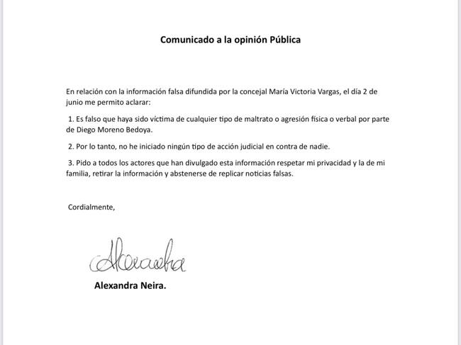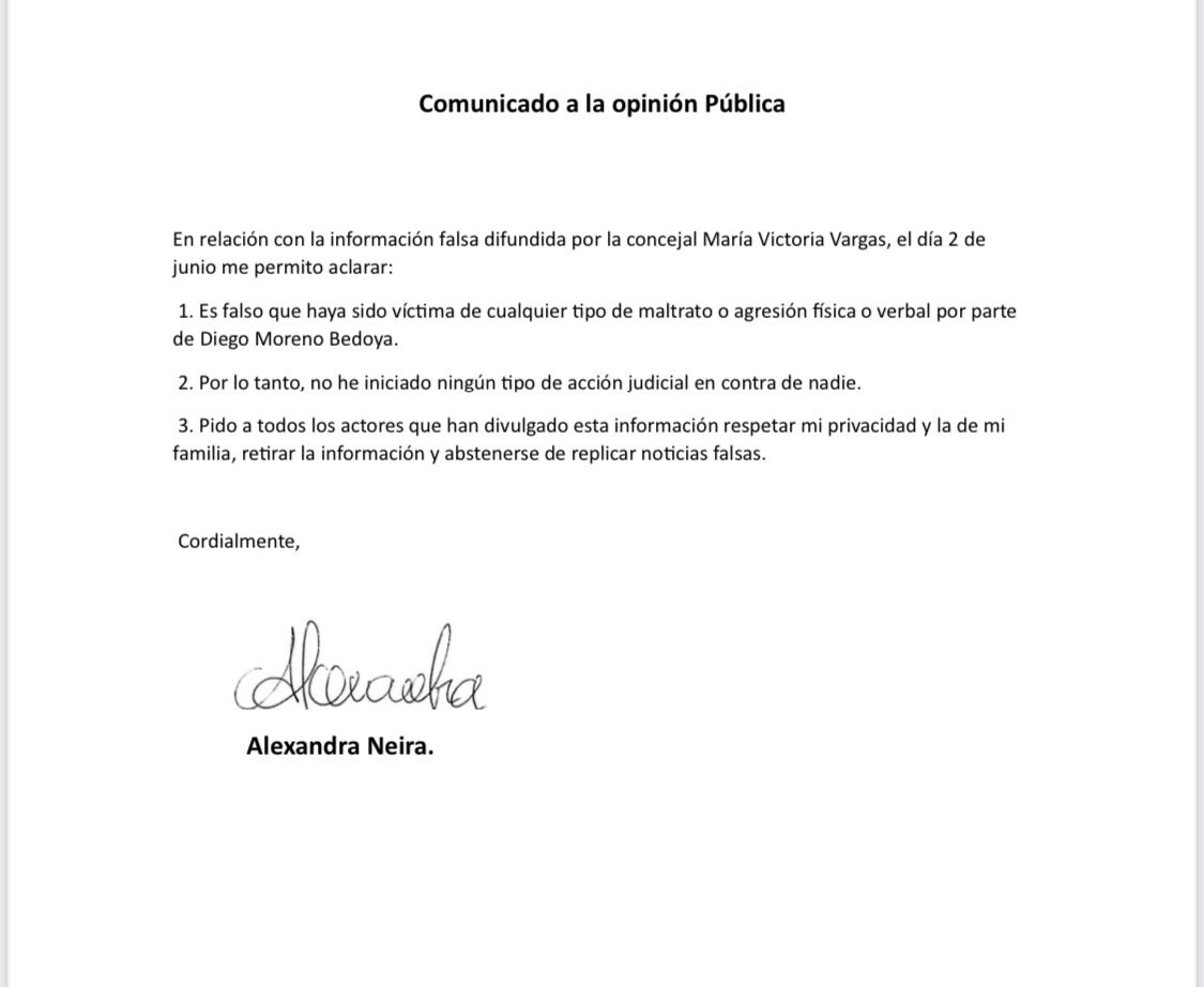 Sin embargo, mediante un comunicado y una publicación en Twitter, la señora Alexandra Neira aseguró que la información entregada por al concejal es falsa: “Concejal María Victoria, le pido que no desinforme ni difunda información falsa de mi vida personal. Ni he sido víctima de violencia doméstica ni he denunciado penalmente a Diego Moreno, porque es falso que haya sido agredida por él”. Escribió en su cuenta e Twitter.