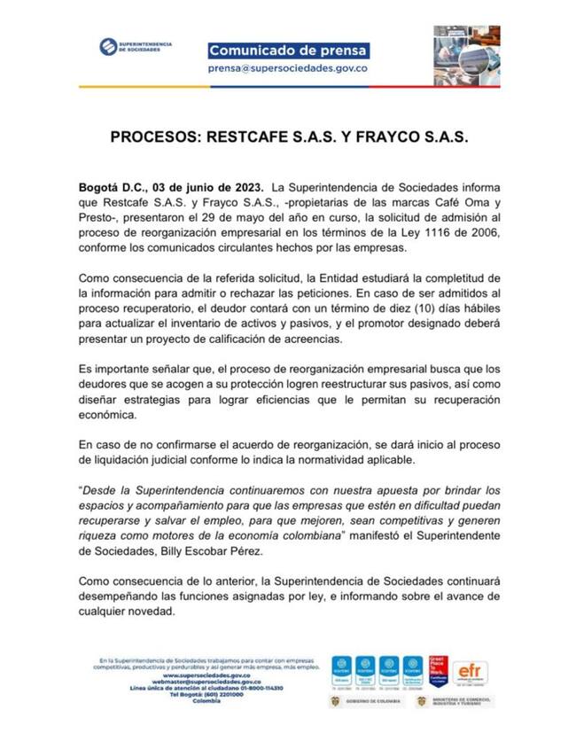 Por medio de un comunicado, Restcafe, propietaria de la marca Café Oma, y Frayco, dueña de la marca Presto, solicitaron acogerse al proceso de la reorganización empresarial, teniendo en cuenta como recurso legal la ley 1116 del 2006, esto con el fin de potenciar su operación en el país y proteger la continuidad del negocio y el empleo.
