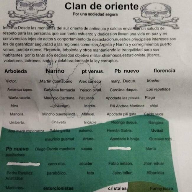 Varios hombres, integrantes al parecer del Clan de Oriente, repartieron el panfleto en distintas veredas y municipios del Oriente antioqueño, entre ellos Argelia y Nariño. En el documento, que circula en dicha subregión, publicaron los nombres de las personas que se encuentran bajo amenaza.