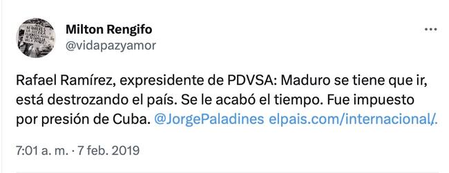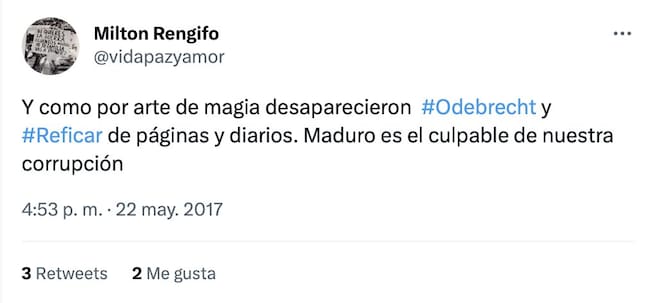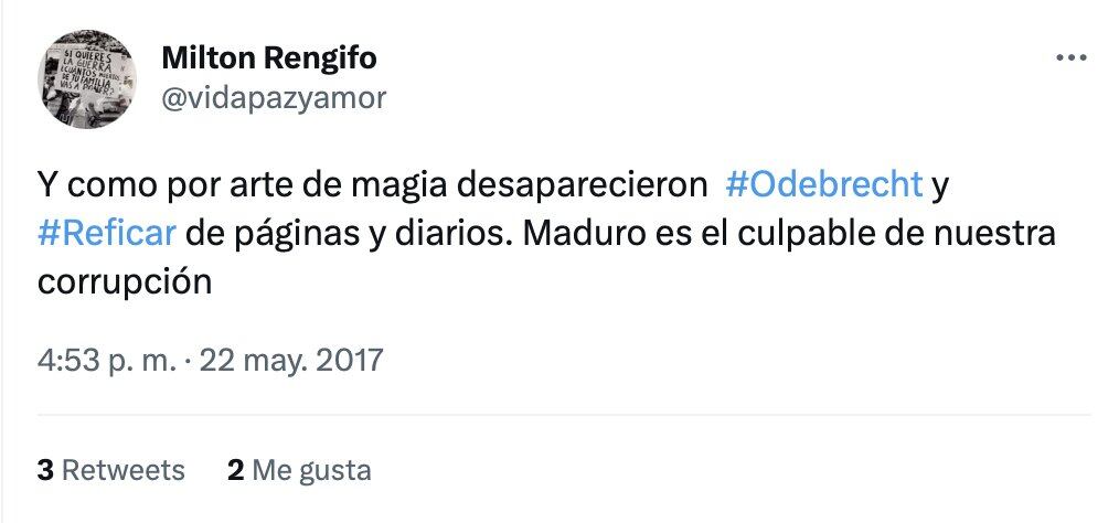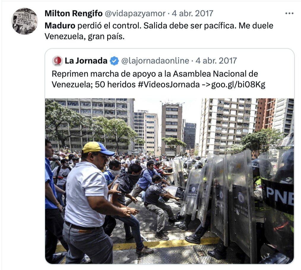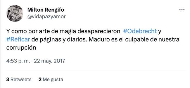 Tan pronto se supo del nombramiento de Milton Rengifo en la Embajada de Venezuela, el funcionario borró su cuenta de Twitter @VIDAPAZYAMOR, después de que la analista venezolana Naxy Soto publicara una serie de trinos del nuevo embajador en los que despotricaba del presidente Nicolás Maduro.