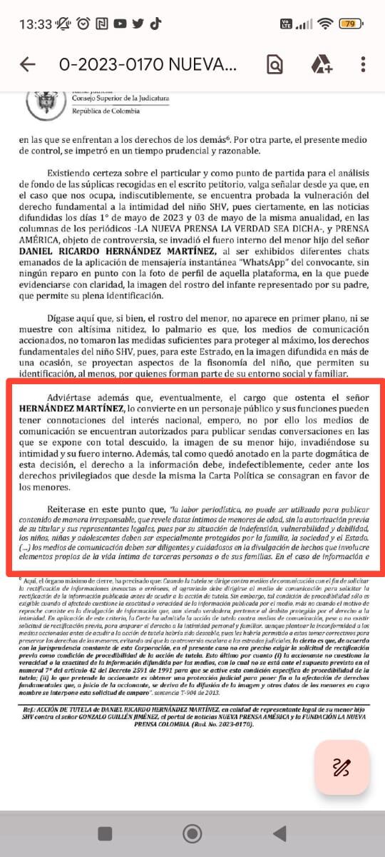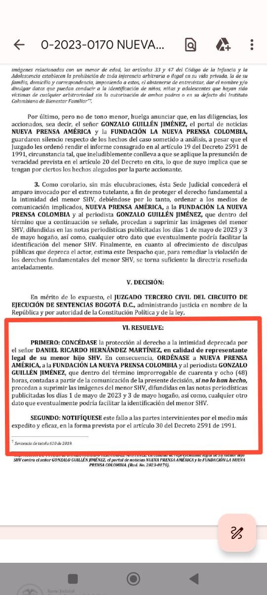 El juez tuteló los derechos del menor porque la publicación de La Nueva Prensa vulneró su intimidad e integridad. En el Consejo de Estado está pendiente de resolverse una tutela en igual sentido contra el Presidente de la República, Gustavo Petro