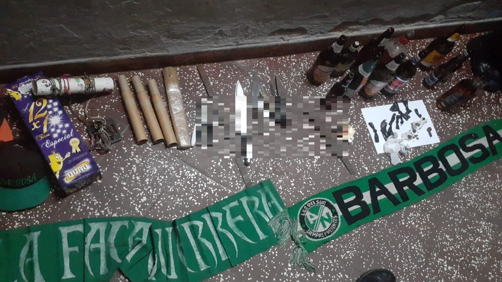 Según el comisario, recibieron denuncias de que los hinchas golpearon algunos vehículos por lo que decidieron usar la fuerza para “reducirlos y derivarlos hasta la comisaría” y allí encontraron que los detenidos tenían marihuana, cocaína, botellas del alcohol y armas blancas.