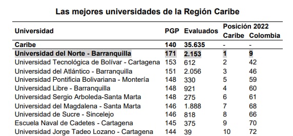De la Región Caribe, solo la Universidad del Norte está entre las diez primeras del país, con un puntaje de 171, alcanzando el puesto nueve nacional; le sigue la Universidad Tecnológica de Bolívar (153) y la Universidad del Atlántico (151), que conforman el top tres de la región.