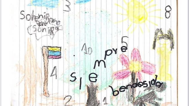 Las enternecedoras imágenes que hizo Lesly retratan al perro Wilson junto a un río lleno de peces, un árbol, flores amarillas y el sol alumbrando su camino. Lo que plasmó Soelini es parecido. Ahí se ve nuevamente al perrito junto a un árbol, una flor y bajo un sol resplandeciente. A un lado está la bandera de Colombia y se lee el mensaje “Siempre bendecida”.