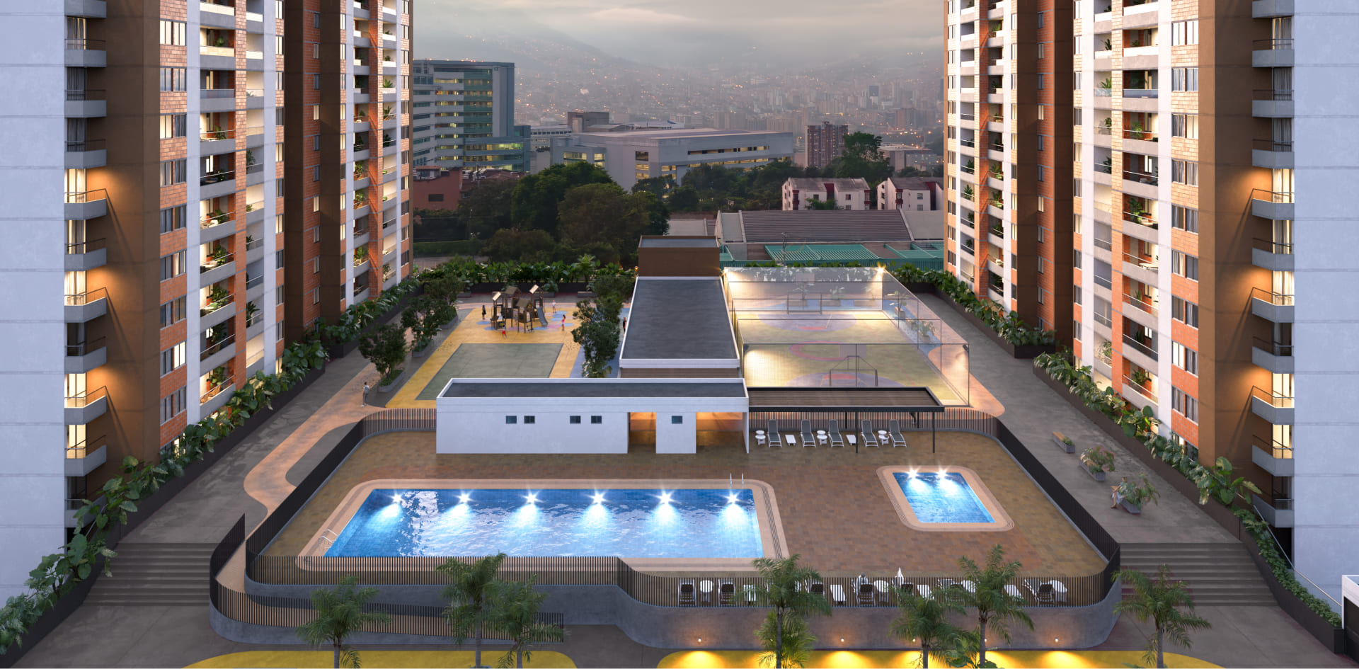 Ofrecen servicios como gimnasio cubierto, circuito de triciclos, zona de mascotas, salón de juego de niños, cancha recreativa, coworking, zona BBQ, senderos exteriores, piscinas de adultos y niños; baby fútbol, juegos infantiles y salón social.