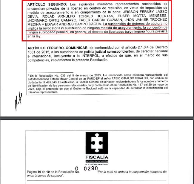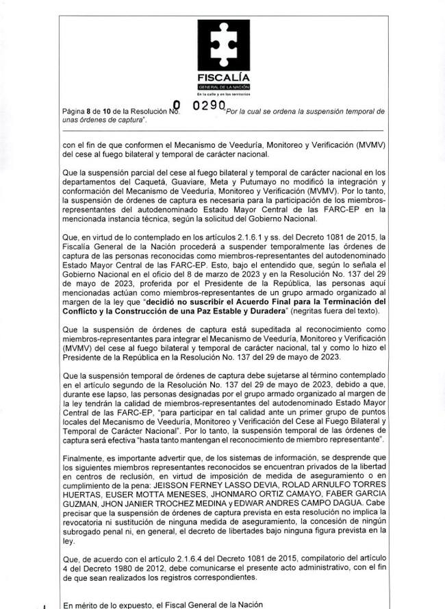 Se indica en la resolución de la Fiscalía que la suspensión parcial del cese al fuego bilateral en los departamentos del Caquetá, Guaviare, Meta y Putumayo no modificó la integración y conformación del Mecanismo de Veeduria, y, por lo tanto, “la suspensión de órdenes de captura es necesaria para la participación de los miembros representantes del autodenominado, según consideró la petición del gobierno nacional”.