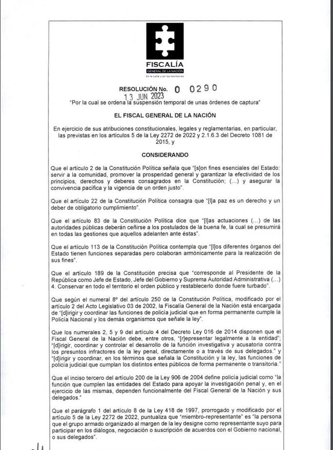Se indica en la resolución de la Fiscalía que la suspensión parcial del cese al fuego bilateral en los departamentos del Caquetá, Guaviare, Meta y Putumayo no modificó la integración y conformación del Mecanismo de Veeduria, y, por lo tanto, “la suspensión de órdenes de captura es necesaria para la participación de los miembros representantes del autodenominado, según consideró la petición del gobierno nacional”.