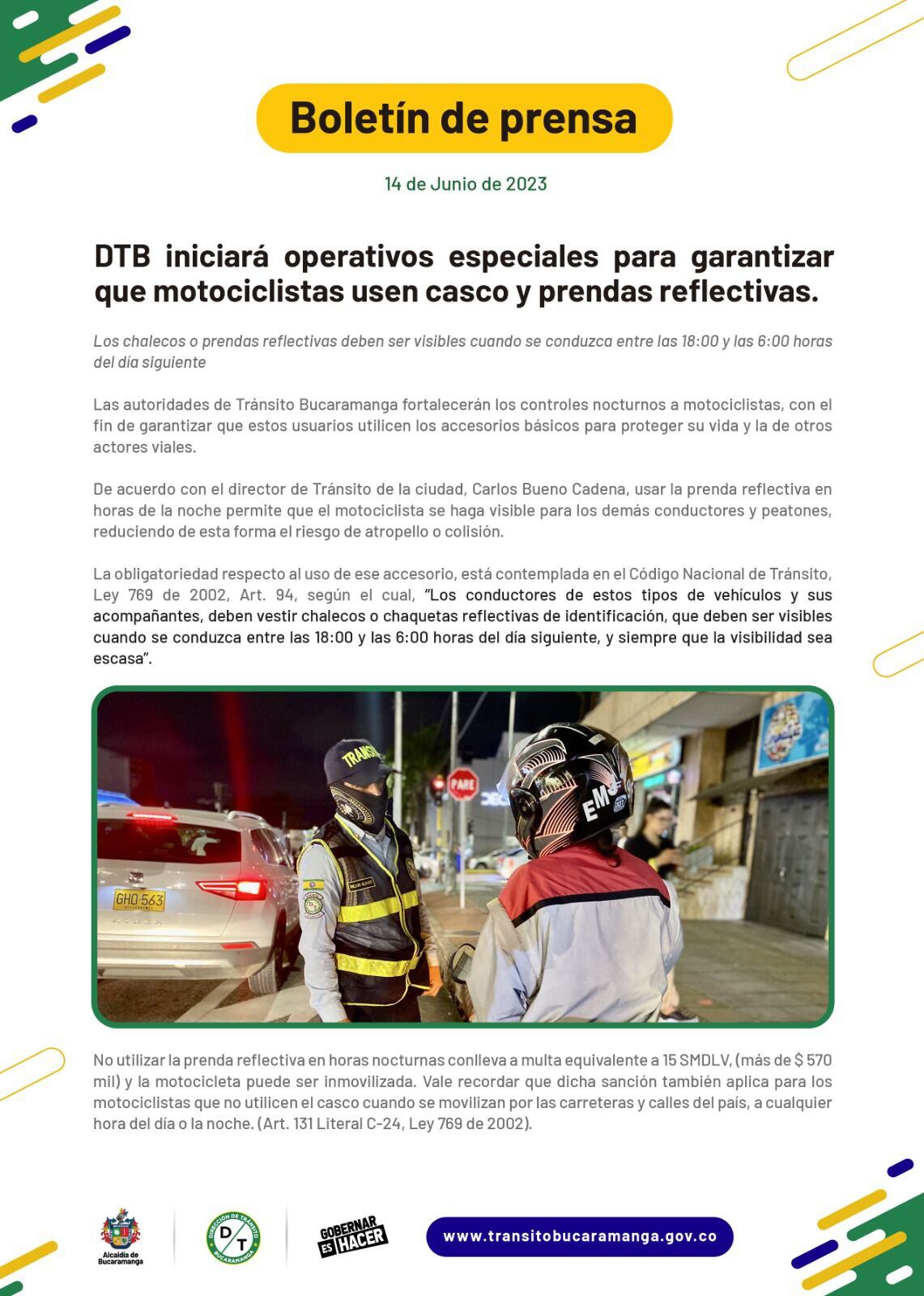 El director de tránsito de Bucaramanga, Carlos Enrique Bueno, informó que se fortalecerán los operativos a los motociclistas para verificar que hagan uso del casco y del chaleco reflectivo.