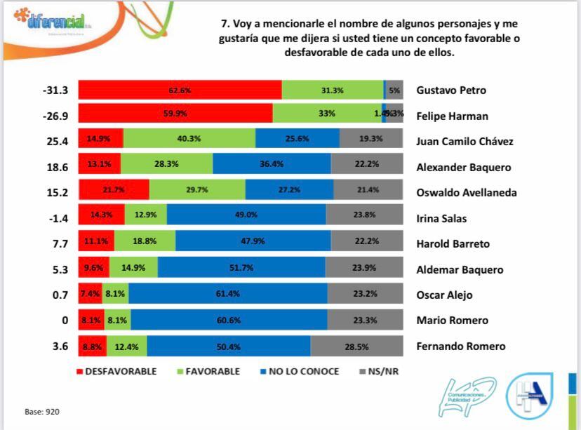 Según la más reciente encuesta de percepción política y electoral para la Alcaldía de Villavicencio, el índice de favorabilidad ante los posibles votantes estaría encabezado por el diputado Juan Camilo Chávez del partido Alianza Verde que ha subido en las mediciones y está teniendo un crecimiento del 40.3% de aprobación, seguido de Oswaldo Avellaneda con un 29.7%, Alexander Baquero con un 28% y Harold Barreto con el 18.8%.