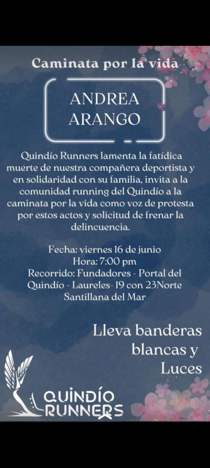 A las 7 de la noche el colectivo Quindío Runners está invitando a esta caminata que se iniciará en el parque de Los Fundadores al norte de la ciudad donde harán un acto en memoria de Andrea Arango Atehortua.