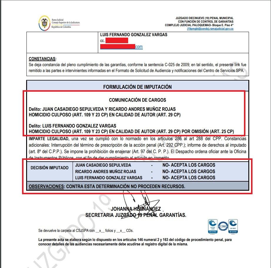 La Fiscalía imputó el delito de homicidio culposo al exgerente del club El Nogal, Luis Fernando Vargas, también a Ricardo Andrés Muñoz Rojas, entonces jefe de Electromecánica y, Juan Casadiego Sepúlveda, exdirector de Mantenimiento de ese exclusivo Club. Ninguno de los procesados aceptó cargos.