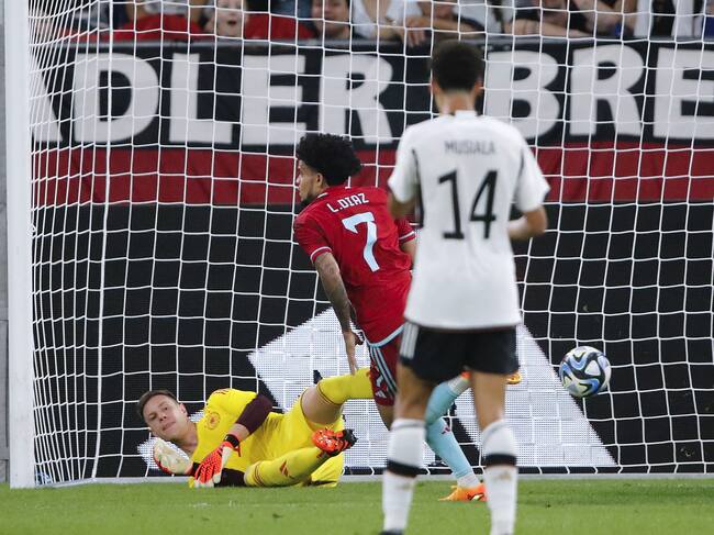 GELSENKIRCHEN - (LR) Luis Diaz of Colombia scored the 0-1, Germany goalkeeper Marc-Andre ter Stegen, Jamal Musiala of Germany during the friendly international match between Germany and Colombia at Veltins-Arena on June 20, 2023 in Gelsenkirchen, Germany . AP | Dutch Height | BART STOUTJESDYK (Photo by ANP via Getty Images) / ANP