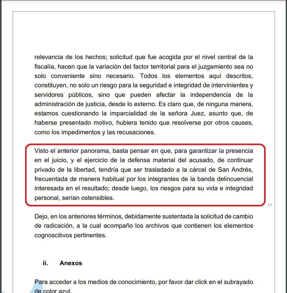 Dice el documento que radicó la defensa que, su cliente, de continuar privado de la libertad, tendría que ser trasladado a la cárcel de San Andrés, frecuentada por integrantes de esa banda criminal.
