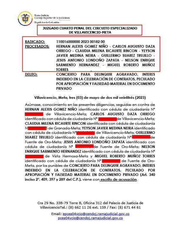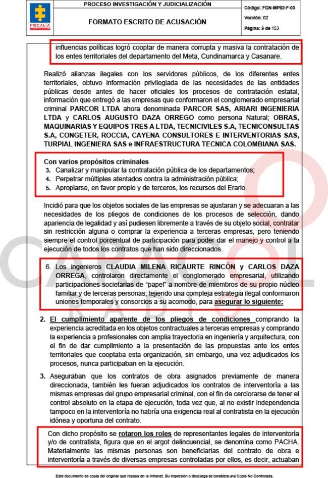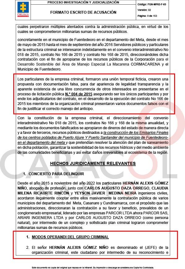 El documento de 153 páginas conocido por Caracol Radio, indica que todos ellos, aparentemente, crearon una empresa criminal que, durante los años 2015 y 2022, direccionó la contratación pública en Meta, Casanare y Cundinamarca.