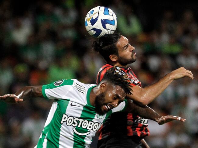 TOPSHOT - Atletico Nacional's defender Cristian Devenish (L) and Patronato's forward Enzo Diaz fight for the ball during the Copa Libertadores group stage second leg football match between Colombia's Atletico Nacional and Argentina's Patronato, at the Atanasio Girardot stadium in Medellin, Colombia, on June 27, 2023. (Photo by Fredy BUILES / AFP) (Photo by FREDY BUILES/AFP via Getty Images) / FREDY BUILES