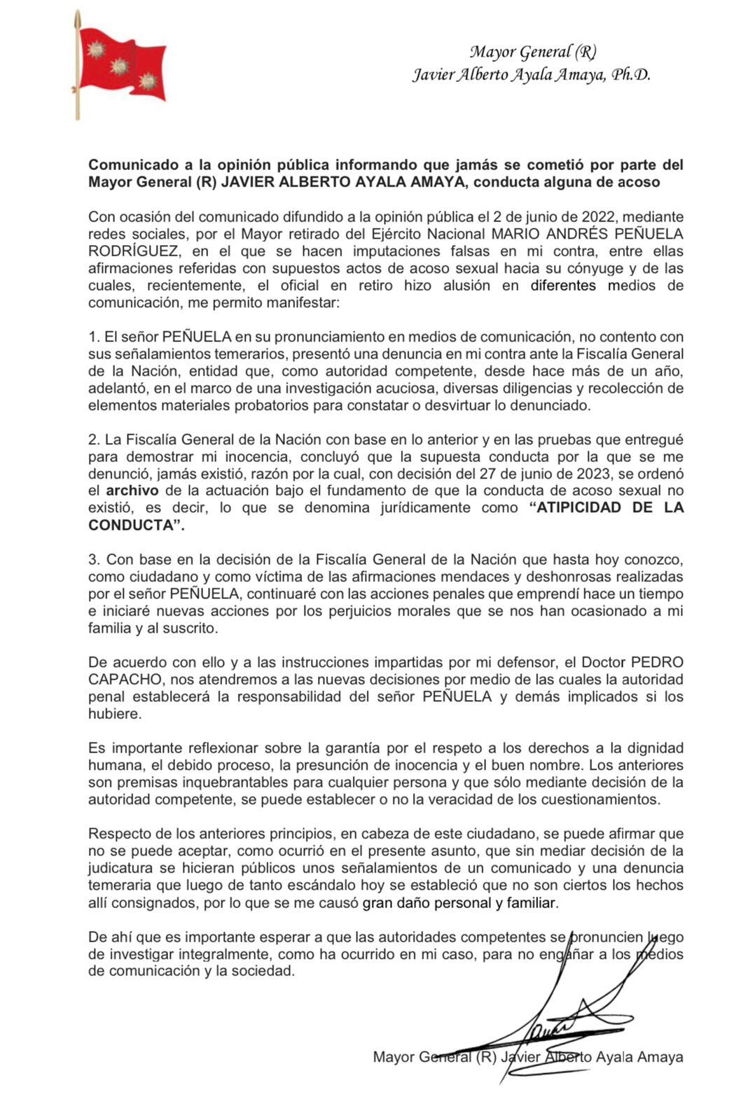 El general retirado, Javier Ayala, informó a través de un comunicado que la Fiscalía General archivó una denuncia que había colocado el mayor, también retirado del Ejército Nacional, Mario Peñuela. Supuestamente, su esposa había sido acosado sexualmente por el ahora rector de la Universidad Militar Nueva Granada.