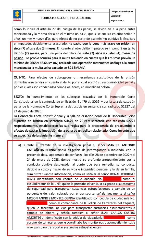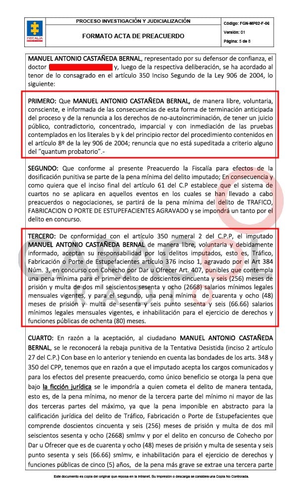 Preacuerdo que firmó el "narco-chofer" Manuel Antonio Castañeda con la Fiscalía