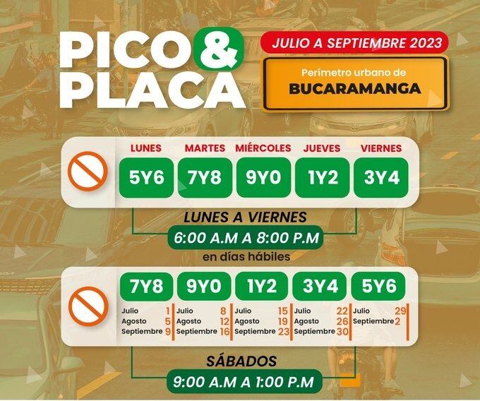 Desde mañana sábado 1 de julio rotará el pico y placa en Bucaramanga. Esta rotación se mantendrá hasta el mes de septiembre y no tendrá semana pedagógica, lo que significa que si alguna persona incumple con la medida, será multado y su vehículo inmovilizado.