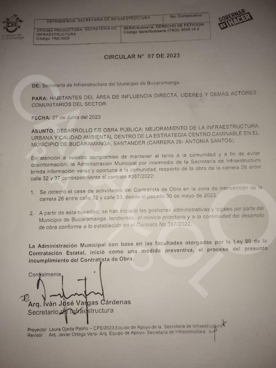 Caracol Radio conoció la comunicación que la Secretaría de Infraestructura de Bucaramanga le envió a la comunidad para notificarle que el Consorcio Ambiental Urbano cesó las obras desde el pasado 30 de mayo.