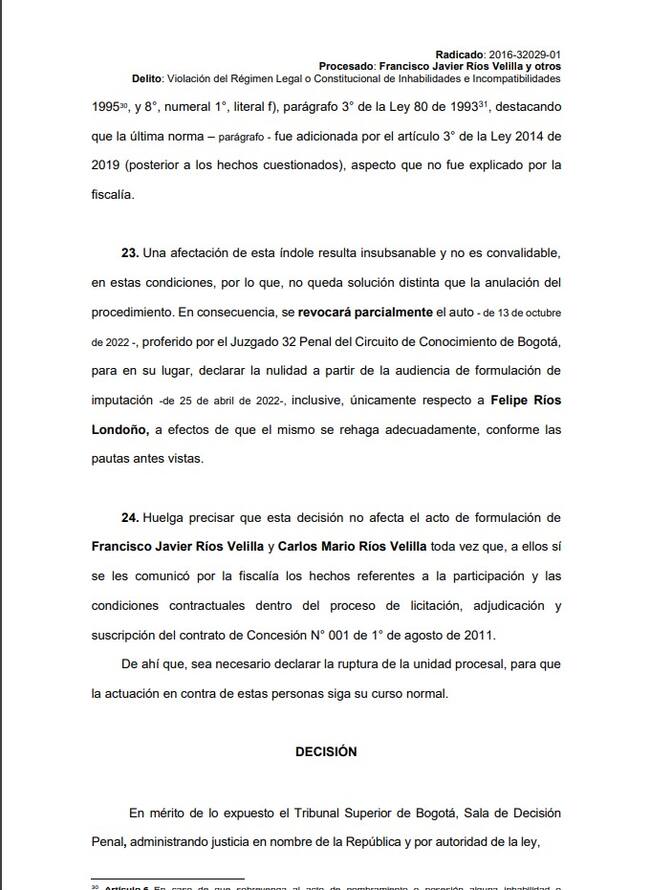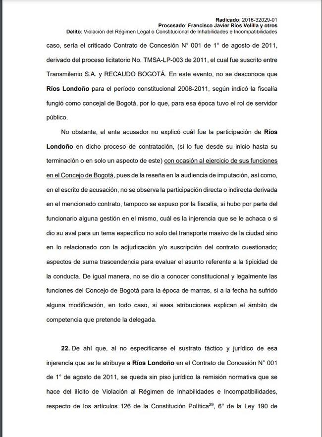 La principal razón de esta decisión, según el fallo del Tribunal, tiene que ver con que la fiscal Angélica Monsalve no explicó cuál fue la participación del exconcejal Felipe Ríos Londoño, en la adjudicación del millonario contrato para el recaudo de los dineros de Transmilenio.