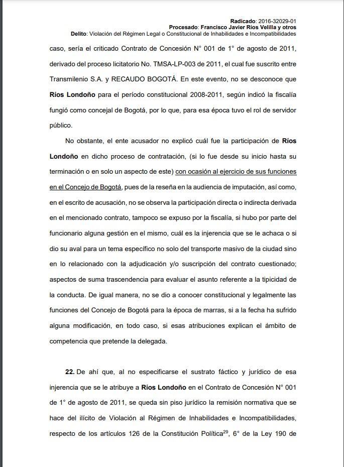 La principal razón de esta decisión, según el fallo del Tribunal, tiene que ver con que la fiscal Angélica Monsalve no explicó cuál fue la participación del exconcejal Felipe Ríos Londoño, en la adjudicación del millonario contrato para el recaudo de los dineros de Transmilenio.