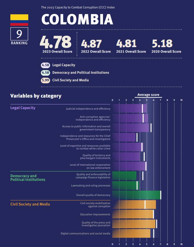 Sobre Colombia, el CCC 2023 señala que ha registrado una mejoría moderada en cuanto a la democracia e instituciones políticas, reversando la tendencia que traía el país con problemas para atender ampliamente los casos de corrupción, aun así “Colombia sigue por detrás del promedio regional” en esta categoría.