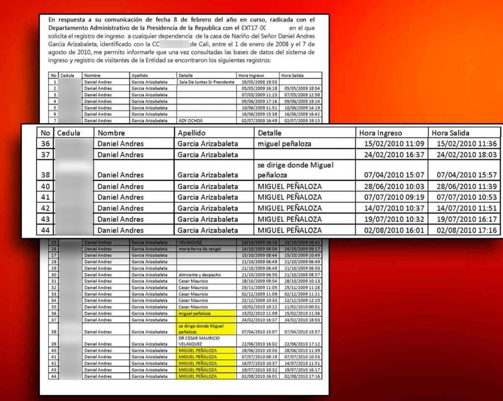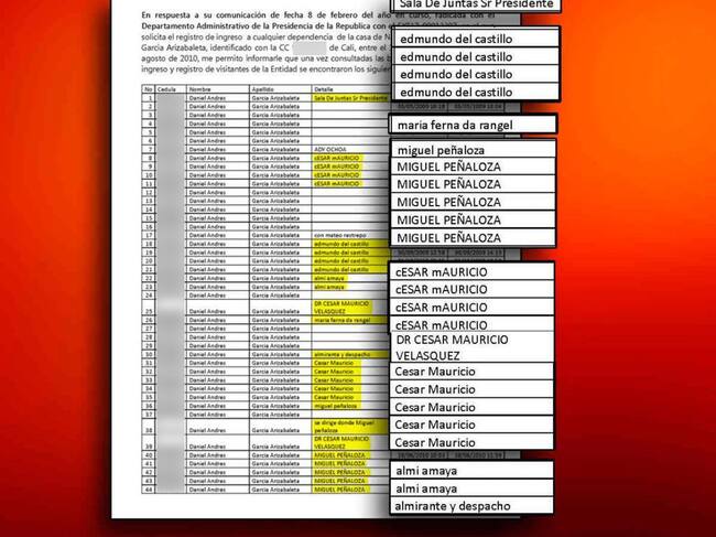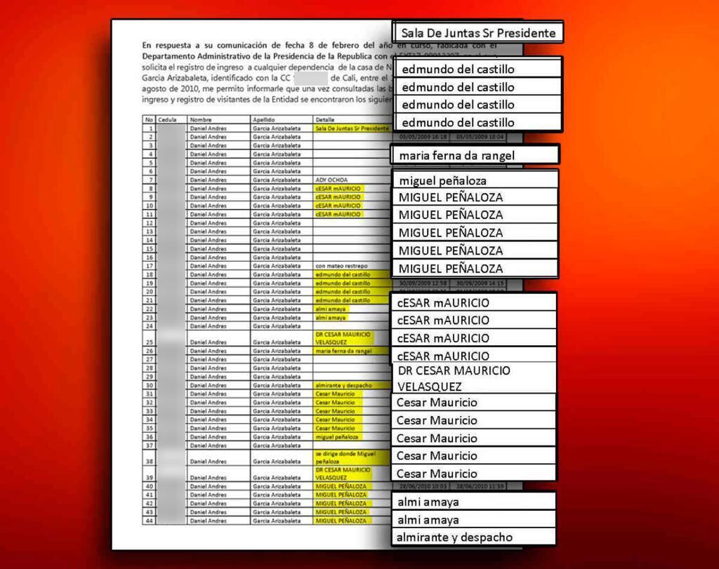 Entre las marcadas aparecen: “Sala de juntas señor presidente”, “Edmundo del Castillo”, quien era el secretario jurídico del gobierno Uribe; “María Fernanda Rangel”, abogada de la Secretaría Jurídica y aspirante a la Contraloría General en la última elección; “Miguel Peñaloza”, por esos días consejero presidencial para las regiones y después ministro de transporte del gobierno de Juan Manuel Santos, el secretario de prensa “César Mauricio” Velásquez; “Almi Amaya”, que se refiere al señor contralmirante Rodolfo Amaya quien era el jefe de la Casa Militar de Uribe.
