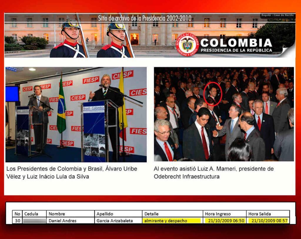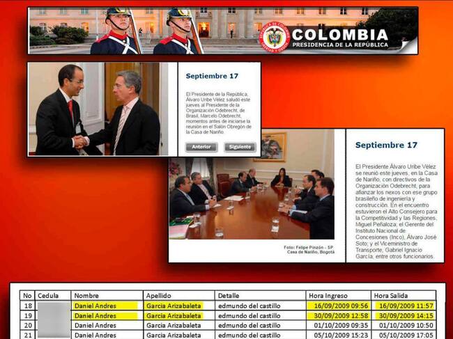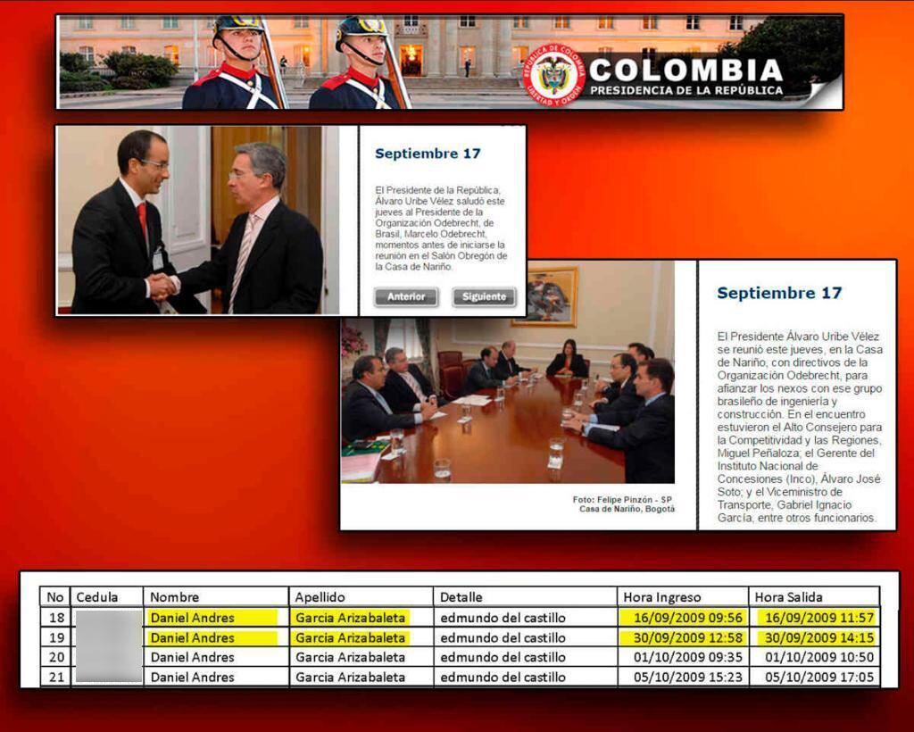 En septiembre y octubre García Arizabaleta visitó cuatro veces la oficina del secretario jurídico de la Presidencia Edmundo del Castillo. Tres de esas visitas duraron más de dos horas. Una de esas visitas sucedió un día antes de la llegada de Marcelo Odebrecht a la Casa de Nariño. La foto oficial muestra que en la reunión con Odebrecht y su gente el entonces presidente Álvaro Uribe, el viceministro de transporte Gabriel García Morales, hoy condenado por los sobornos, el director del Inco Álvaro José Soto y el entonces consejero presidencial Miguel Peñaloza