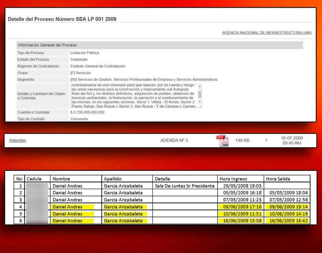 Eso sucedió un viernes. El martes de la semana siguiente, 9 de junio de 2009, García Arizabaleta llegó a Palacio a las 5:16 de la tarde y estuvo hasta las 7:14 de la noche. Al día siguiente regresó a la Casa de Nariño a las 11:51 de la mañana y se quedó hasta las 2:19 de la tarde. En la semana posterior repitió su visita. El martes 16 llegó a las 3:38 de la tarde y allí se quedó hasta las 4:42. Un mes exacto después fue publicada la tercera adenda al pliego que permitía modificar los porcentajes de participación y cambiaba la exigencia de licencias y gastos en los alrededores de la vía.