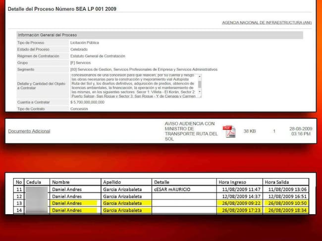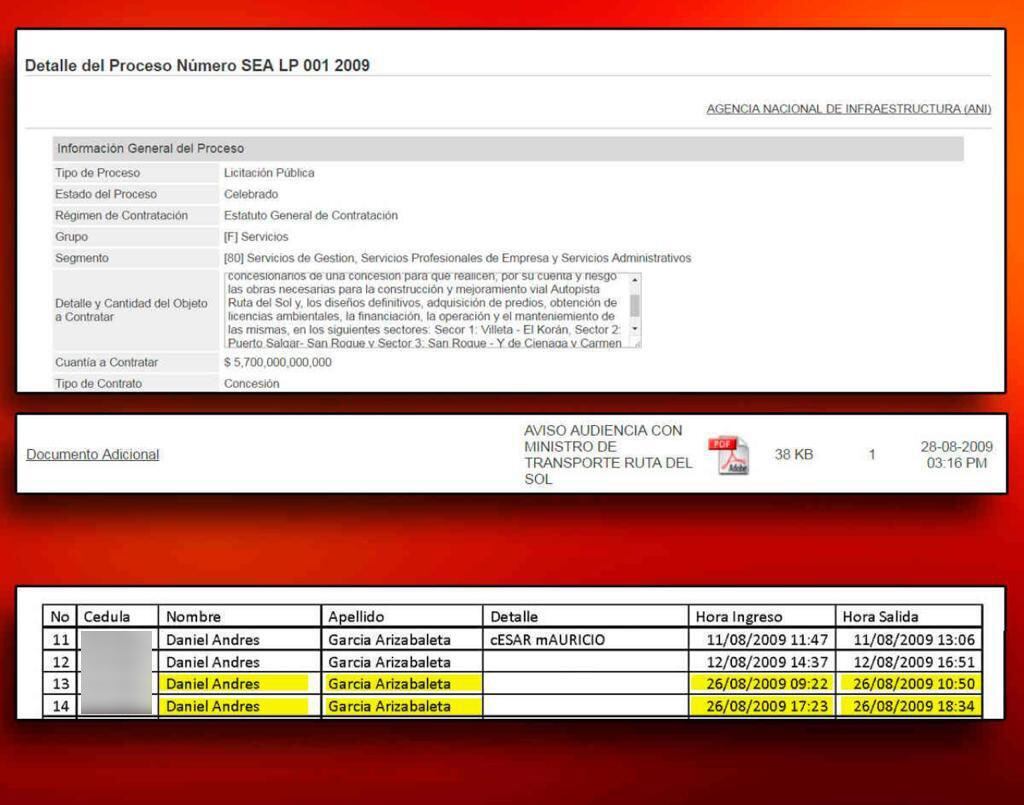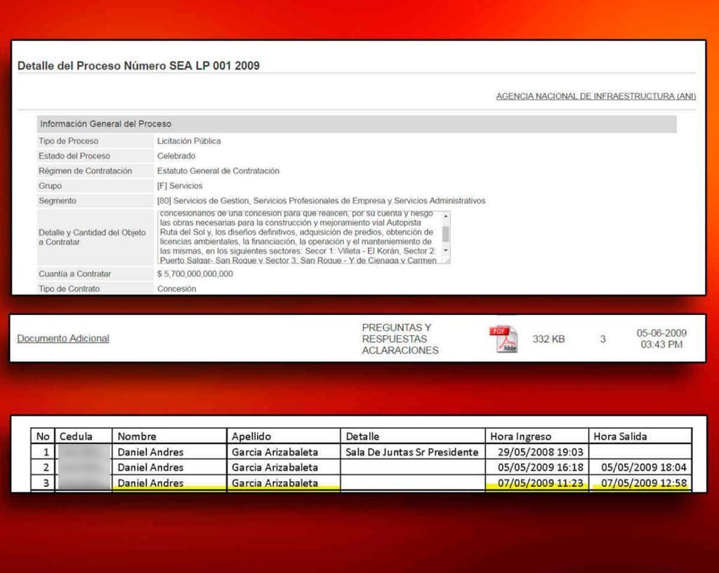 Oficialmente la licitación de la Ruta del Sol se abrió el 27 de marzo de 2009. El 21 de abril se expidió la primera adenda a los pliegos y varios proponentes –entre ellos Odebrecht– hicieron observaciones destinadas a modificar las condiciones. Es precisamente en esos días que empieza una tanda de visitas de Daniel García Arizabaleta a la sede presidencial.