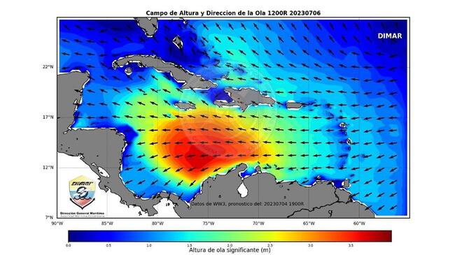 El Centro de Investigaciones Oceanográficas e Hidrográficas del Caribe de la Dirección General Marítima (Dimar), informó que continúan las condiciones de vientos fuertes y oleaje significativo en el Mar Caribe, las cuales impactan a las poblaciones de Puerto Bolívar, Riohacha, Santa Marta, Barranquilla, Cartagena, San Andrés y Providencia.