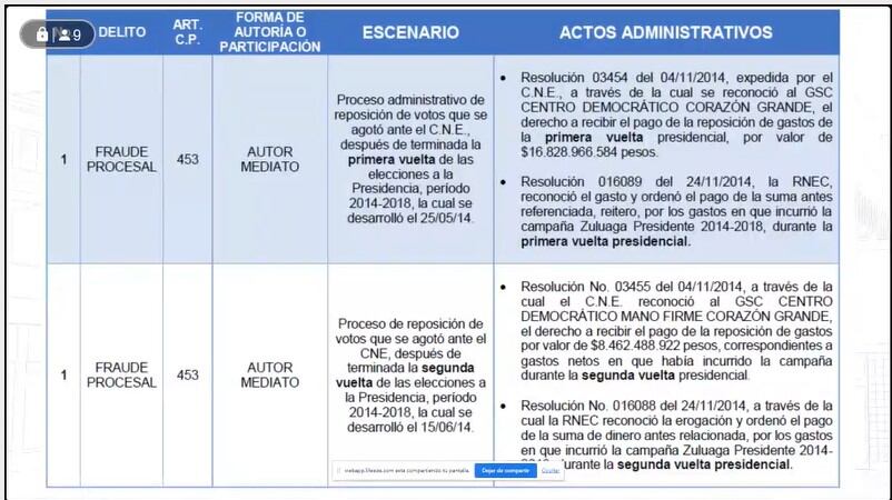 Por el fraude procesal, dijo la Fiscalía, que, Óscar Iván Zuluaga y su campaña hizo incurrir en error al CNE, esa autoridad electoral expidió la resolución 03454 de abril de 2014, con la cual se ordenó el pago de $16.828′966.584 por reposición de votos.