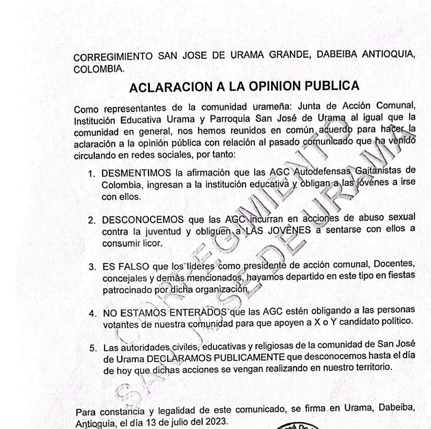 Caracol Radio también conoció que el pasado miércoles 12 de julio, hubo una reunión en la cancha del corregimiento San José de Urama a donde asistió gran parte de la población y se analizó la denuncia de los presuntos abusos sexuales por parte del grupo ilegal. De ahí salió un comunicado dónde se retractan de dicha denuncia y niegan conocer lo antes denunciado. A este medio de comunicación le han asegurado desde la zona que dicho encuentro habría sido convocado por las Autodefensas Gaitanistas de Colombia o Clan del Golfo para supuestamente obligar a la comunidad a retractarse y redactar el comunicado firmado por tres líderes del territorio. Por obvias razones nadie quiere manifestarse sobre esta denuncia.