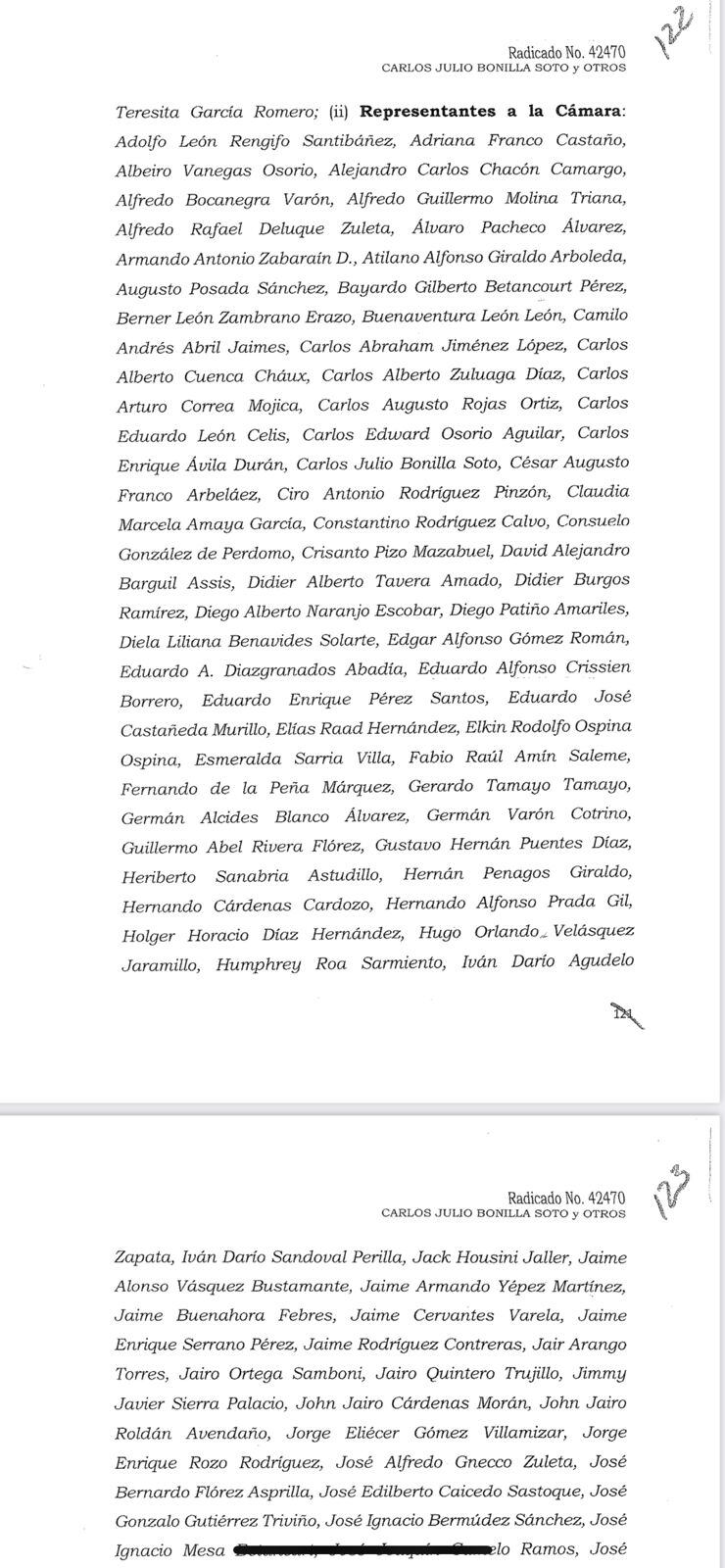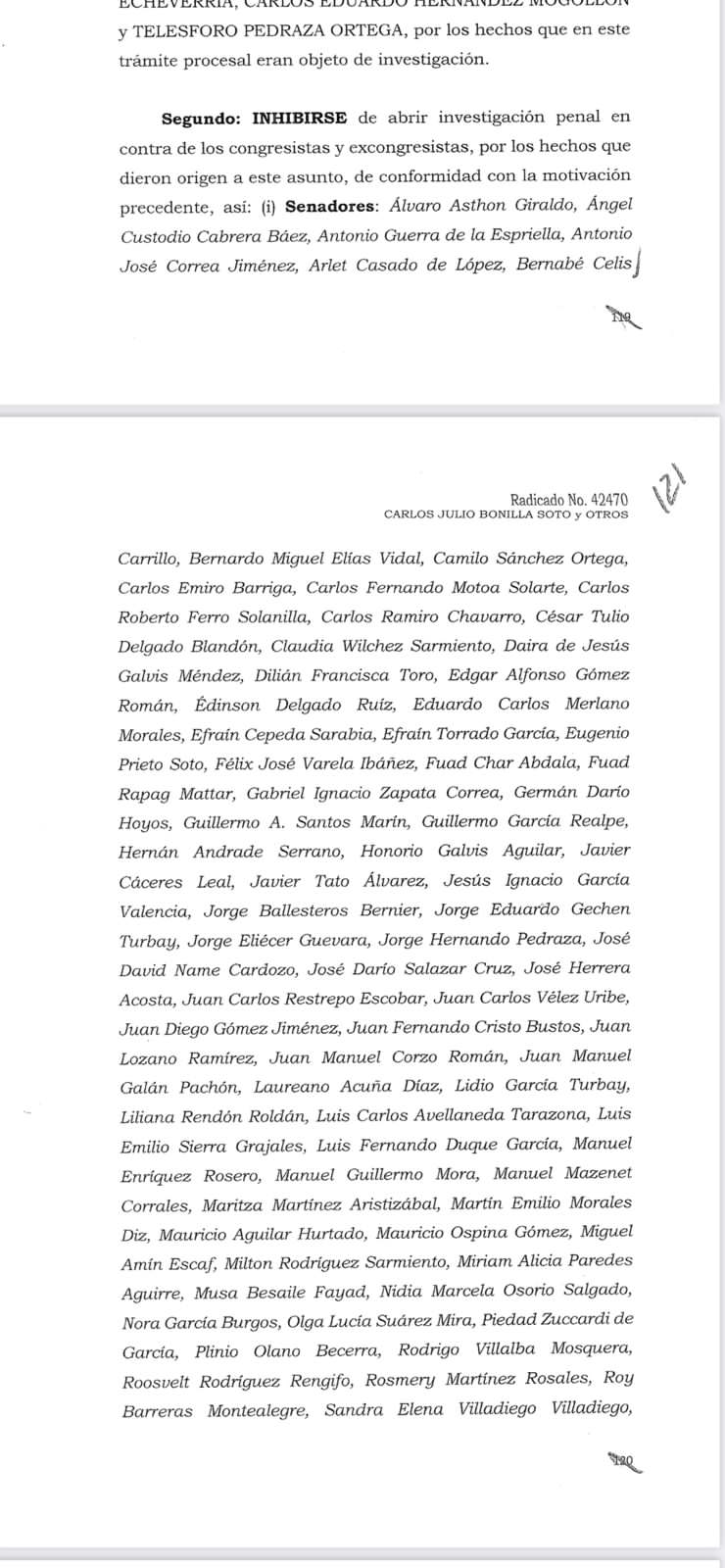 “La Corte se inhibe de continuar con esta investigación debido a que no encontró nada que indicara que se hubieran recibido ese tipo de dádivas ni beneficios. También encontró que las actividades desarrolladas estuvieron amparadas por la inviolabilidad parlamentaria”.