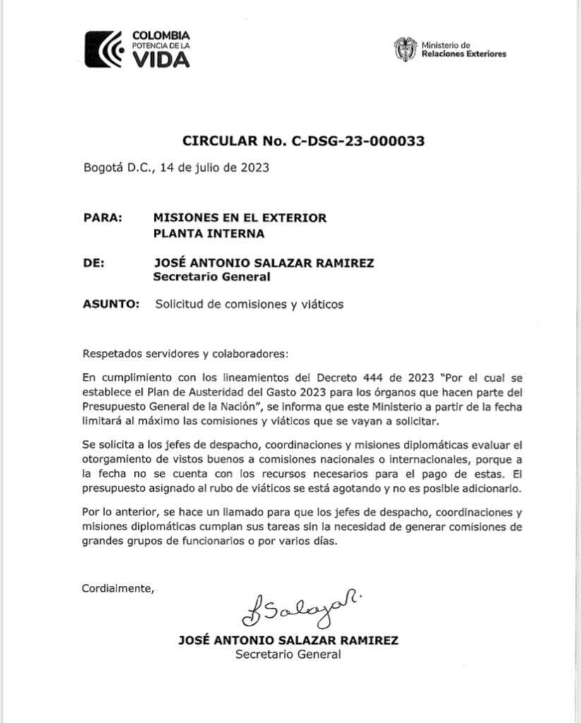 Por ello, y en el marco del Decreto 444 de 2023 ‘por el cual se establece el Plan de Austeridad del Gasto’, el funcionario ha hecho “un llamado para que los jefes de despacho, coordinaciones y misiones diplomáticas cumplan sus tareas sin la necesidad de generar comisiones de grandes grupos de funcionarios o por varios días (...) Este ministerio a partir de la fecha limitará al máximo las comisiones y viáticos que se vayan a solicitar”.
