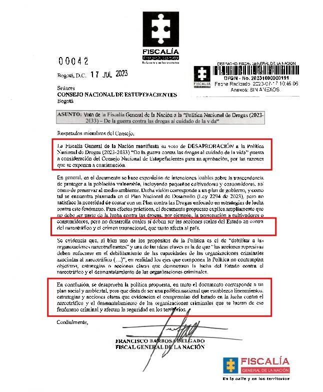 “Nuestro voto de desaprobación por primera vez en 30 años de la Fiscalía General de la Nación contra la política nacional de drogas que presentó el gobierno del presidente Gustavo Petro”, recalcó.