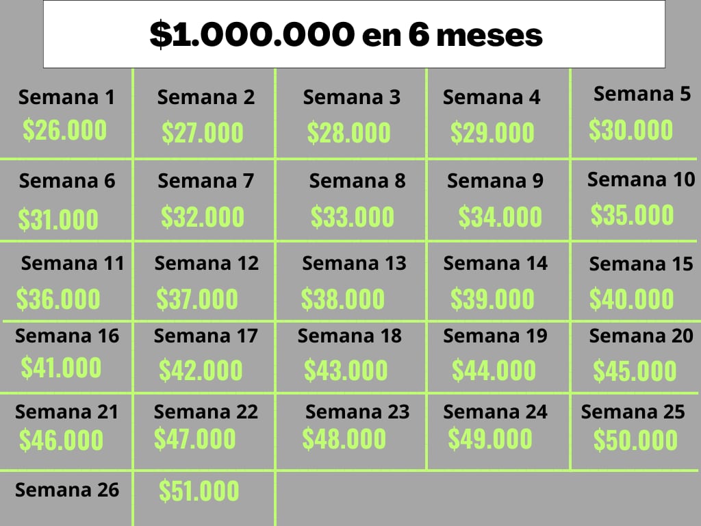 Deberá iniciar de la siguiente manera: ahorre la primera semana $26.000 y a las siguientes semanas súmele $1.000 pesos al monto inicial, es decir, la segunda semana serán $27.000, la tercera $28.000 y así hasta completar 26 semanas.