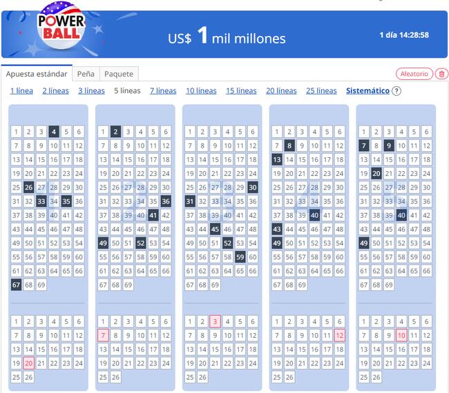 3. Elige cinco números principales y un número adicional. Puedes usar tus números de la suerte o hacer clic en el botón Aleatorio para que tus números se generen automáticamente.