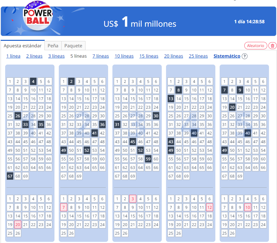 3. Elige cinco números principales y un número adicional. Puedes usar tus números de la suerte o hacer clic en el botón Aleatorio para que tus números se generen automáticamente.