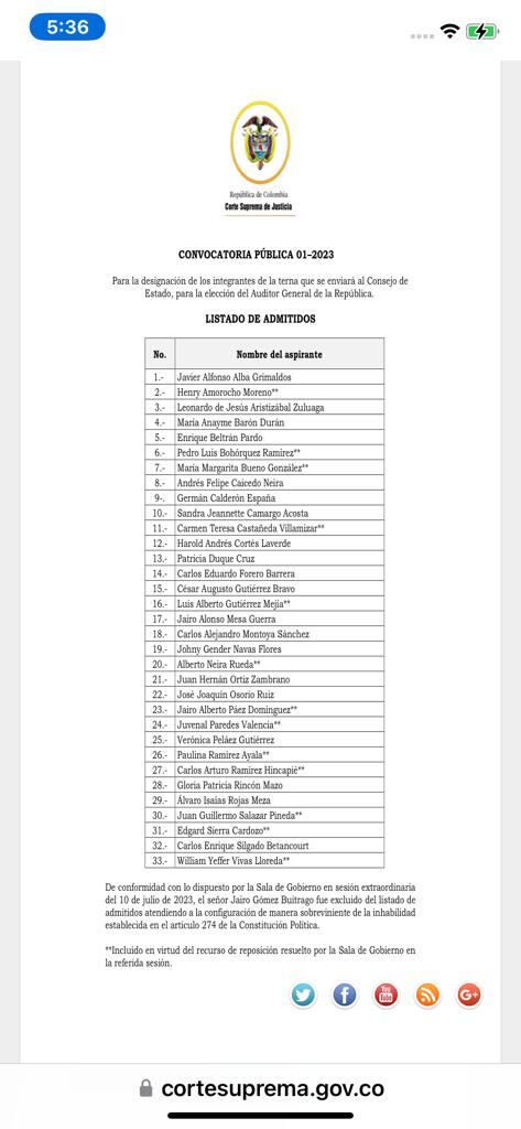 En la parte final de la lista, que es un Auto de la Sala de Gobierno de la Corte Suprema, establece la inhabilidad por lo cual, en el proceso que viene los contralores delegados o el mismo contralor que tumbaron (Carlos Hernán Rodríguez) e inclusive, el vicecontralor, los fiscales delegados, los procuradores delegados, ninguno de ellos podrá participar porque estarían inhabilitados. Y eso que están listos para ingresar al concurso a lo que le pondremos el oído y la lupa.
