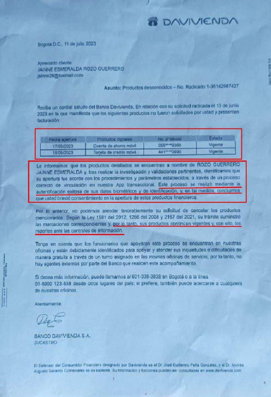 La víctima es Jainne Esmeralda Rozo, la jefe de prensa del Tribunal Superior de Bogotá. Resulta que, el pasado 17 de mayo, delincuentes abrieron una cuenta de ahorros a su nombre, y al día siguiente, el 18 de mayo, sacaron una tarjeta de crédito por $20 millones de los cuales ya se gastaron $10 millones. Ambos productos en el banco Davivienda.