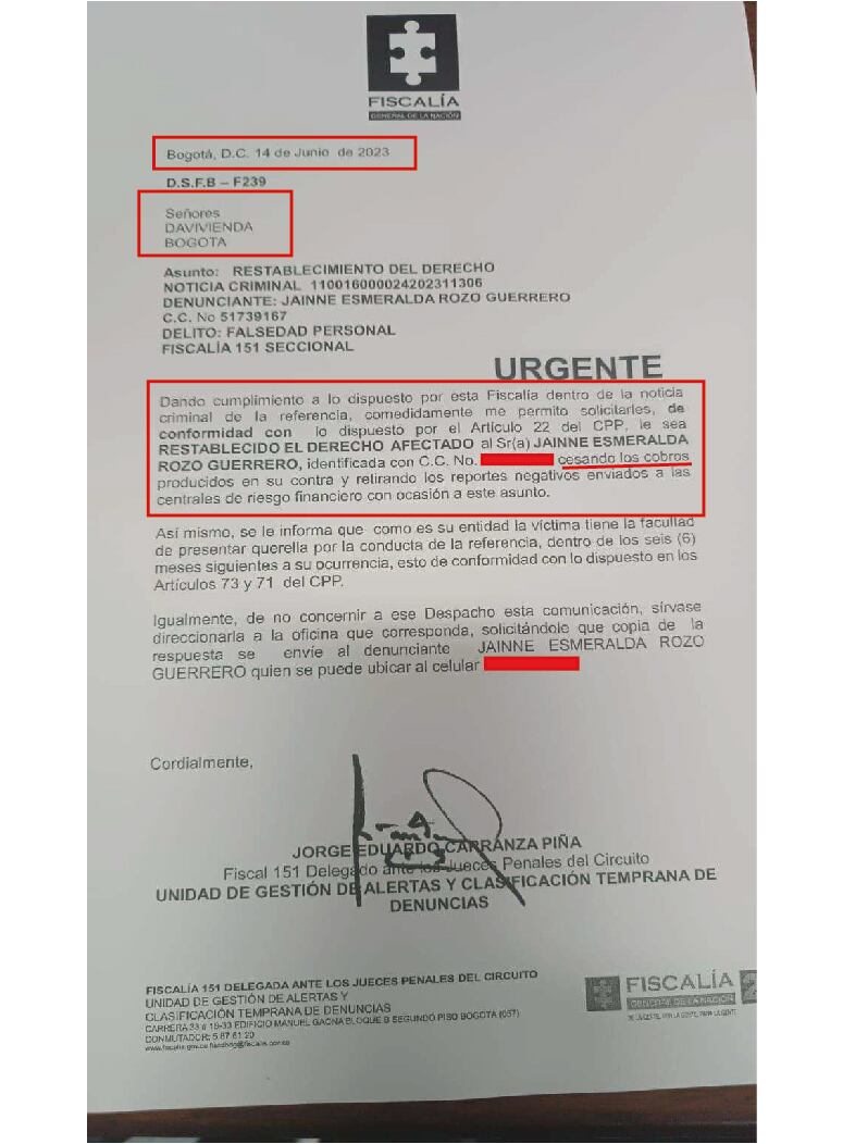 La Fiscalía abrió un proceso por el delito de falsedad y el 14 de junio le envió un oficio al banco Davivienda en el que pide que cese el cobro porque ella es víctima. (ver documento)
