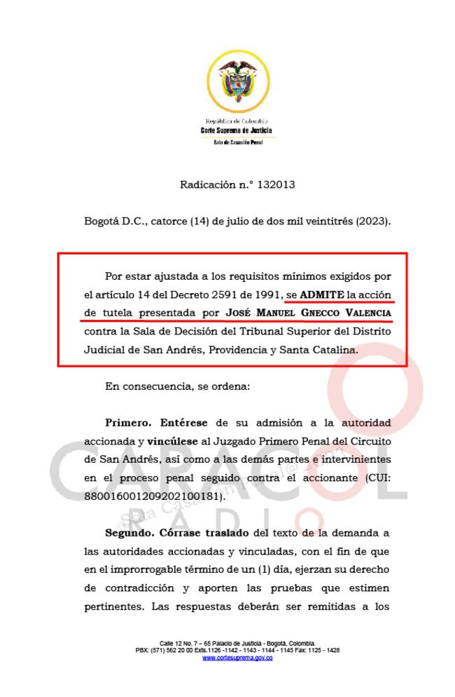 La Sala de Casación Penal de la Corte Suprema de Justicia, admitió para su estudio una tutela con la cual, la defensa de José Manuel Gnecco busca que el juicio en su contra se traslade de San Andrés a Bogotá.