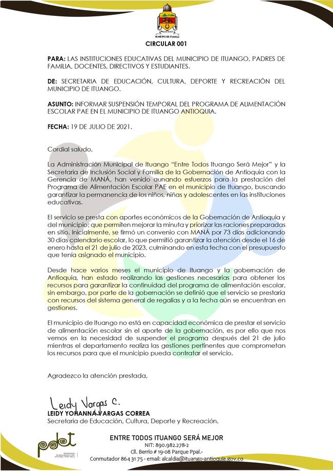 En el escrito la alcaldía detalla “El municipio de Ituango no está en capacidad económica de prestar el servicio de alimentación escolar sin el aporte de la gobernación, es por ello que, nos vemos en la necesidad de suspender el programa después del 21 de julio mientras el departamento realiza las gestiones pertinentes que comprometan los recursos para que el municipio pueda contratar el servicio”.