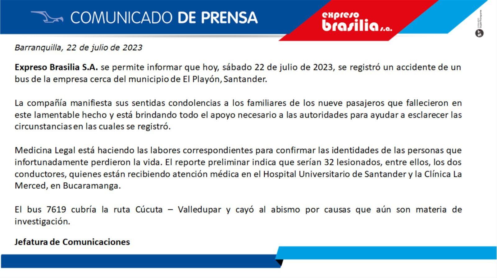“Hoy es un día muy triste para nosotros”, dijo la empresa Expresso Brasilia S.A. tras enterarse del grave accidente que sufrió el bus 7619 en el que se transportaban 40 migrantes desde Cúcuta hacia Valledupar.