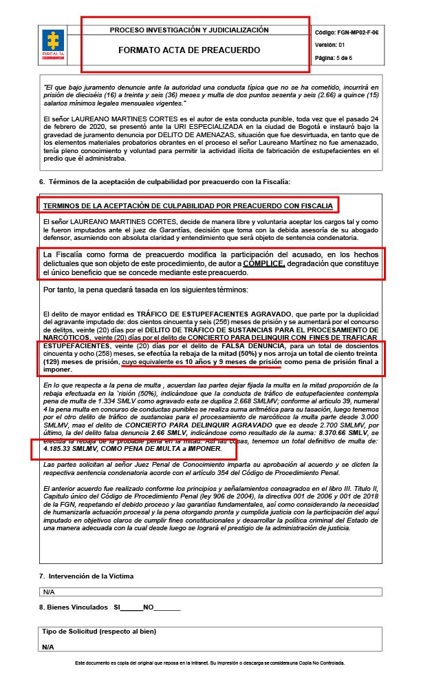 El documento conocido por Caracol Radio, dice que Martínez se declaró culpable y aceptó su responsabilidad por los delitos de tráfico de estupefacientes agravado; Concierto para delinquir con fines de narcotráfico; tráfico de sustancias para el procesamiento de narcóticos y falsa denuncia.